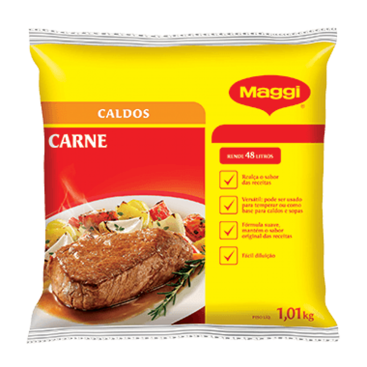 MAGGI® Caldo de Carne possui sabor intenso, e garante mais rendimento e mais sabor para suas receitas. Sua cor neutra não altera a cor original das preparações. Pode ser utilizado para temperar ou como base para sopas e caldos.